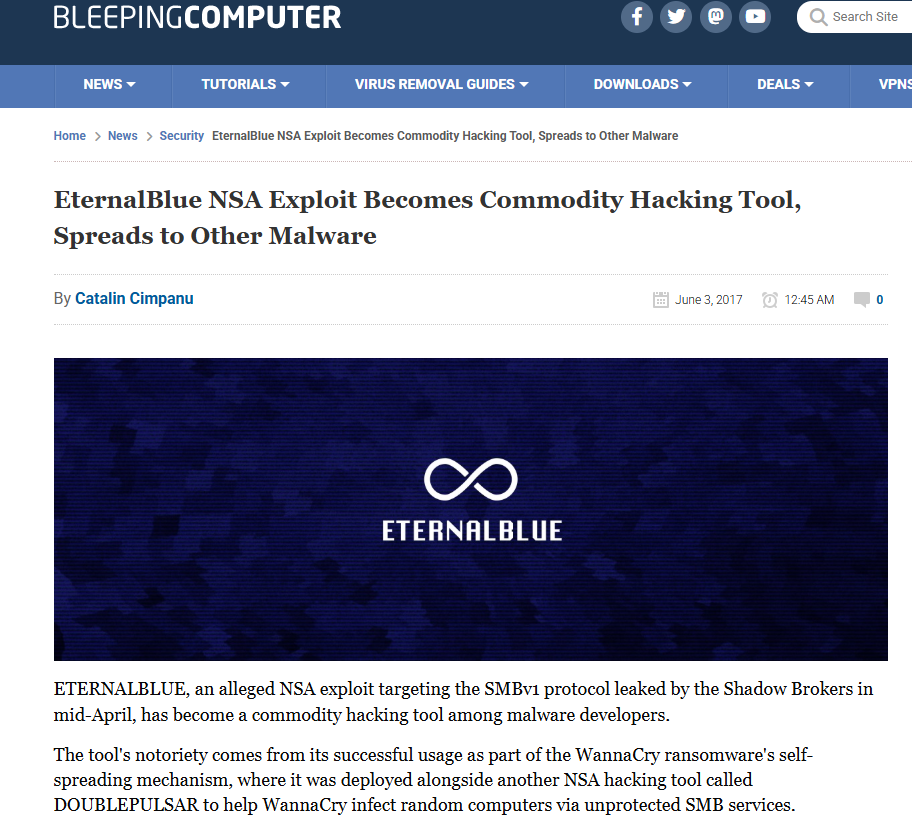 셰도우브로커스 사건은 후폭풍도 거셌다. 이 때 수십 기가바이트에 달하는 해킹 도구들이 세상에 공개됐는데, 그 중 대표적인 것이 이터널블루(EternalBlue)다. 성능 좋은 해킹 도구가 어이없이 공개되면서 공격자들은 너도 나도 이것을 가져다 쓰기 시작했다. 한 때 NSA가 비밀리에 사용하던 도구가 전 세계 해킹 범죄를 촉진시키는 계기가 되기도 한 것이다. 이 이터널블루는 훗날 워너크라이(WannaCry) 랜섬웨어와 낫페트야(NotPetya) 사태의 배경이 되기도 한다.
