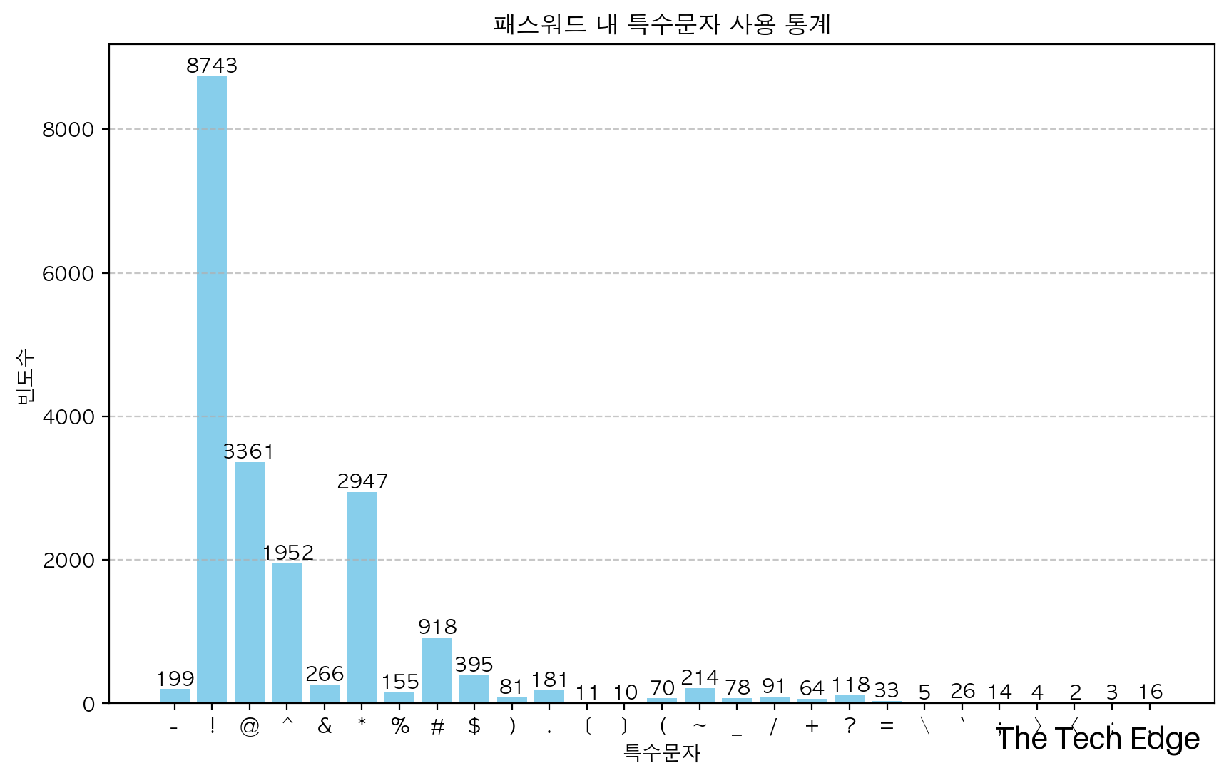 이 문건에 나타난 바에 따르면 한국 사람들은 어떤 특수문자를 선호할까? 따로 분석하지 않더라도 다들 머릿속으로 ‘!’와 ‘@’를 떠올릴 것이다. 실제 파일 내 문자열들을 전수 집계했을 때, ‘!’가 1위,’@’가 2위를 차지했다. 3위는 ‘*’이었고, 4위는 ‘^’였다.