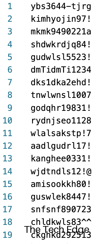 일단 파일을 열어보니 총 20,829개의 패스워드가 저장돼 있었다. 47만 개 이상의 패스워드 문자열을 담고 있었던 pass.txt에 비하면 소량이다. 하지만 숫자로만은 보이지 않는 것이, 실제 이 korear.kr_plain_text_password.txt를 여니 보였다. 한 행에 문자열 하나, 그것도 전부 같은 12자 길이로만 저장돼 있었던 것이다.