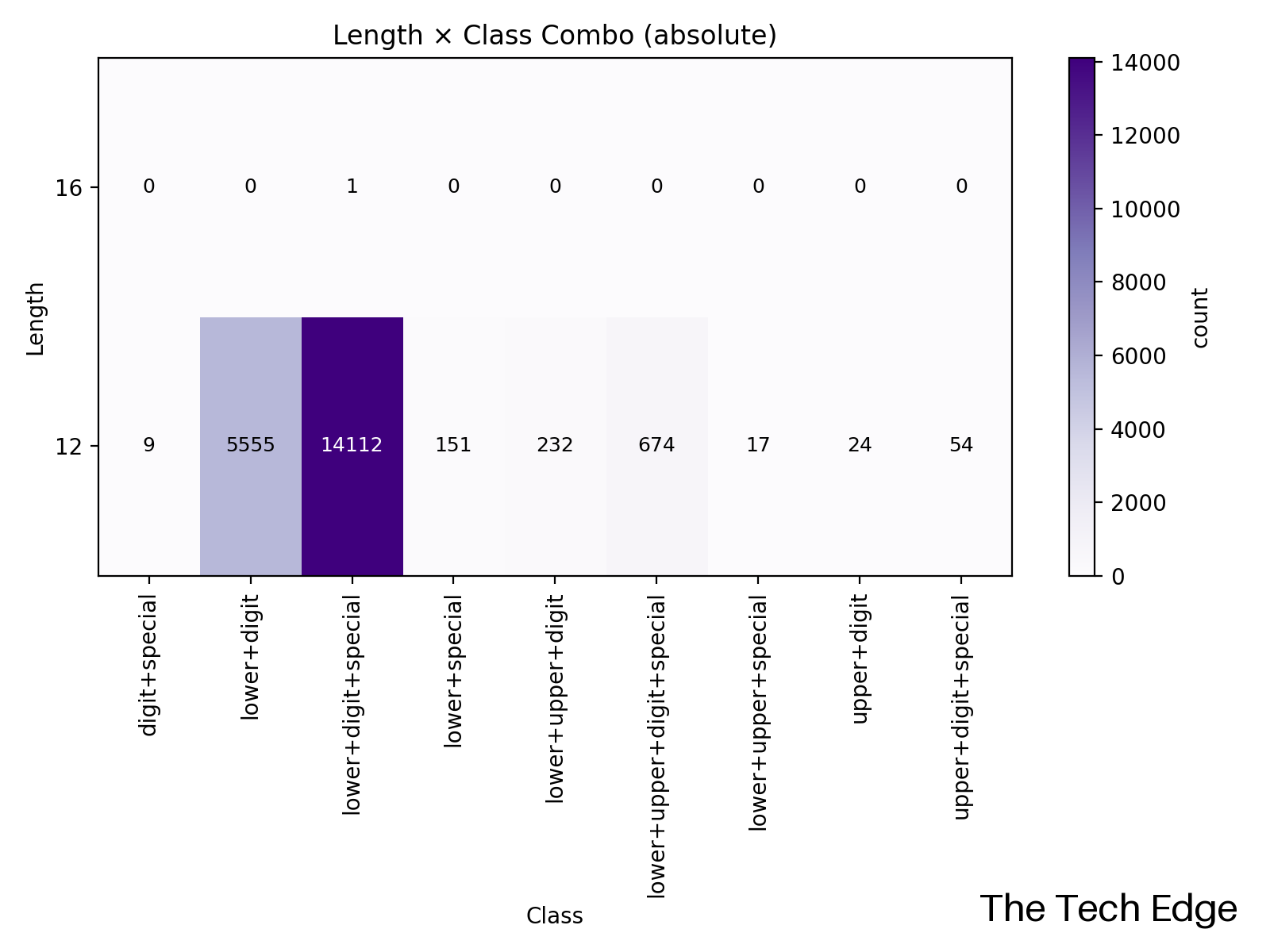 이 히트맵에 따르면 소문자와 숫자의 조합이 5555개로 총 26.67%를 차지하고 있음을 알 수 있다. 소문자와 숫자, 특수문자의 조합은 14,112개로 무려 67.76%의 비율을 이루고 있다. 이를 ‘패스워드를 크랙한다’는 맥락에서 바라보면 어떤 의미가 될까? 대문자는 무시해도 된다는 뜻이 된다. 소문자(26)와 대문자(26), 숫자(10)와 특수문자(29) 조합으로 패스워드를 고루 구성하면 91개의 문자를 사용해야 하는데, 여기서 대문자가 빠지면 65개로 줄어든다. 크래킹 시간과 효율이 크게 높아진다. 12자 패스워드를 사용하고는 있지만 ‘방어 잠재력’을 다 살리지는 못하고 있는 상황이다.