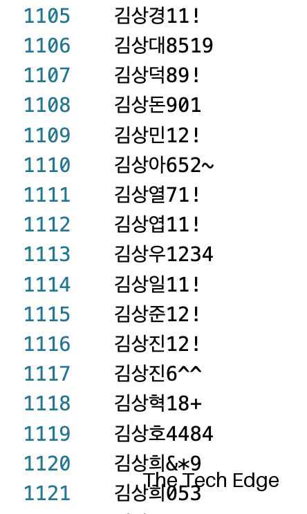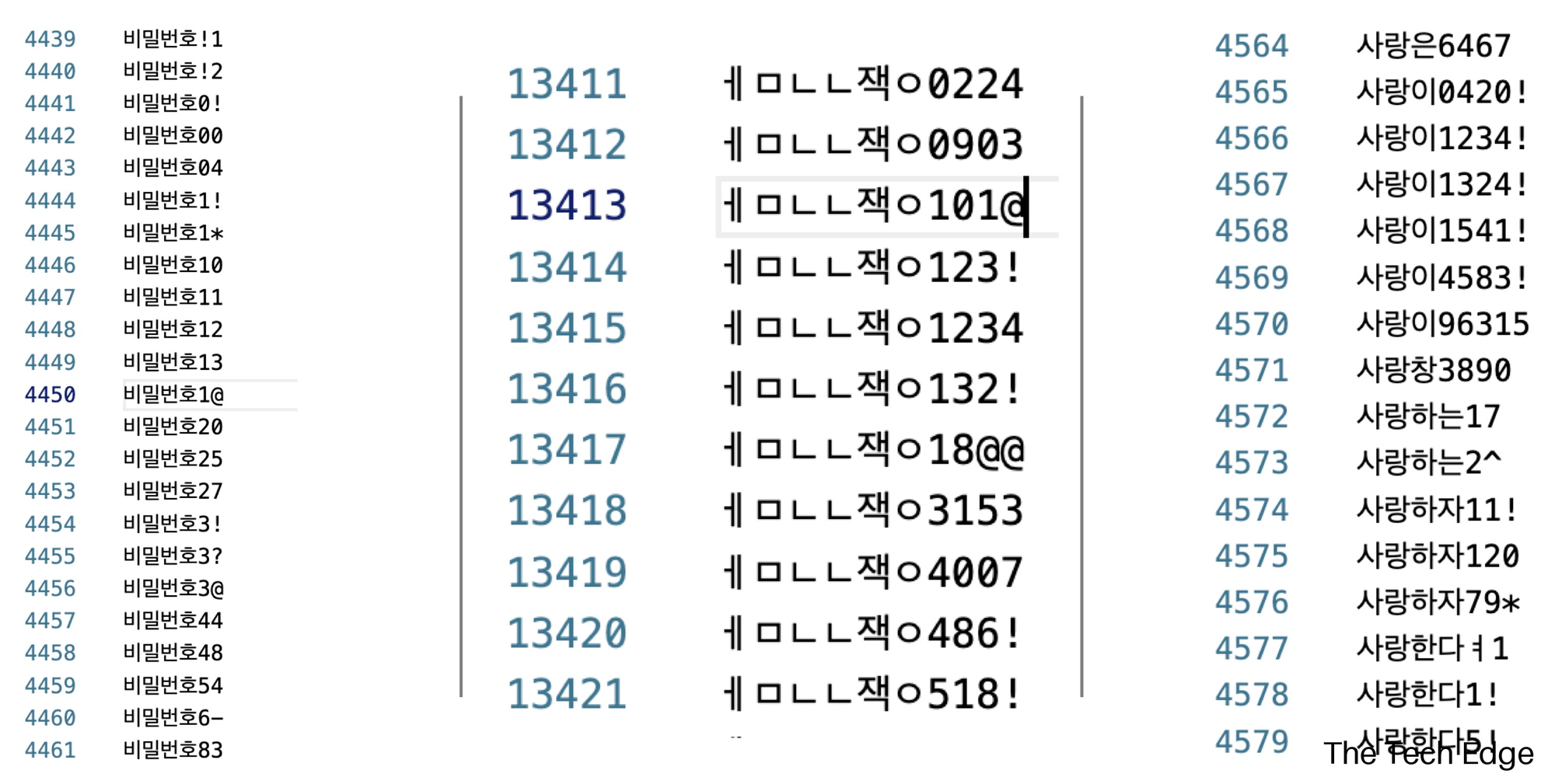korear.kr_plain_text_password.txt 파일을 처음 열자마자 한국 사람은 딱 느낌이 온다. 저장된 문자열 상당수가 한글을 영타로 놓고 친 거라는 것. pass.txt 분석 때와 동일한 작업을 이어갔다. 그리고 가나다 순으로 결과를 정리했다. 예상한 그대로의 결과가 나왔다. 일례를 보면 다음과 같다.