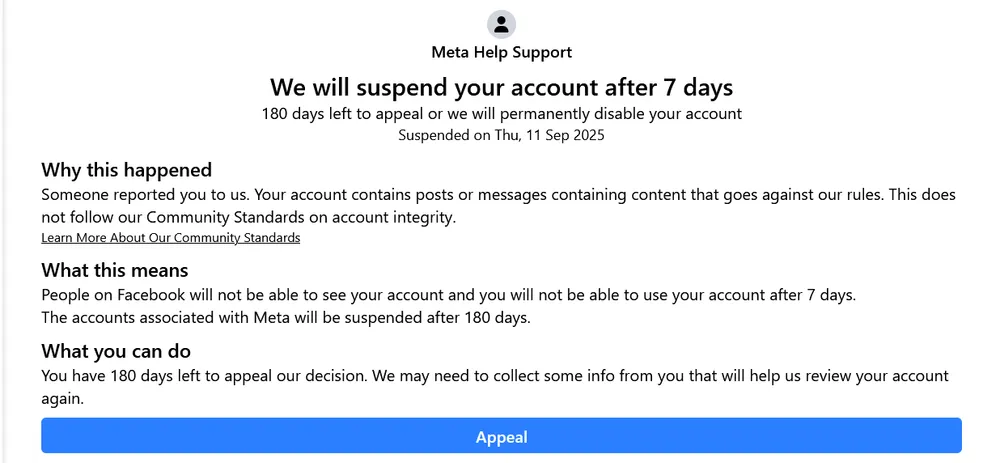 공격자들은 먼저 피해자에게 경고 메시지를 하나 보낸다. 귀하가 정책을 위반했기 때문에 페이스북 계정이 차단될 수 있다는 내용이다. 이의를 제기하기 위해서 이런 저런 사이트로 접속하라는 안내 메시지도 덧붙는다. 이 이의 제기 사이트가 함정이다. 공식 메타 지원 페이지를 흉내 낸 피싱 페이지인 것이다.