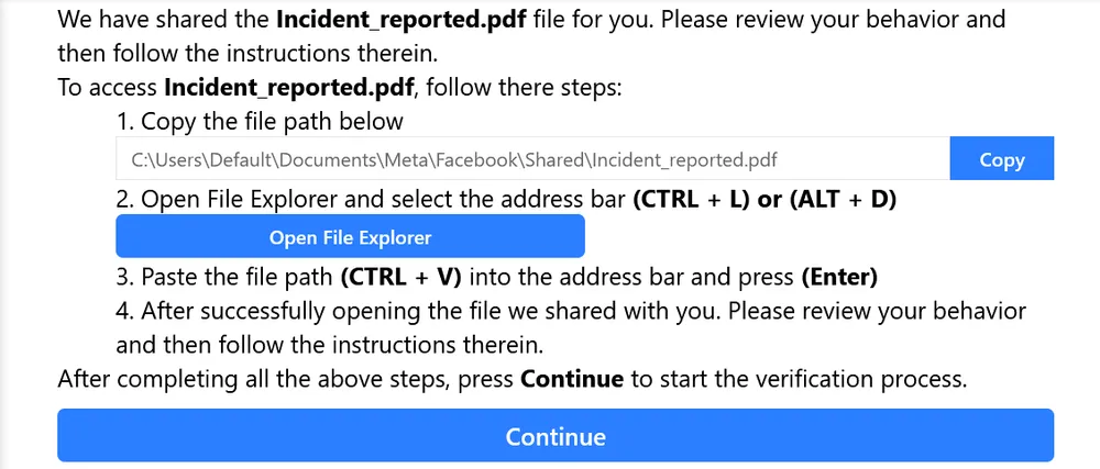 여기에서 피해자는 이의 제기 절차가 안내된 PDF 문서에 대한 정보를 제공 받는다. “메타 팀에서 방금 안내 PDF 문서를 보냈다는 메시지가 전달됩니다. 그런데 그 문서를 그냥열어 보라는 게 아니라 파일탐색기를 열고 그 PDF 파일의 ‘경로’를 주소창에 복사해 넣으라고 합니다. 이를 그대로 실행하면 ‘파일을 찾을 수 없다’는 메시지가 뜨면서 ‘계속’ 버튼이 생깁니다. 이 버튼을 누르면 ‘나머지 절차를 마무리 하세요’라는 오류 메시지가 뜨고요. 사용자 입장에서는 이의 제기를 하고 싶은데, 파일이 없다는 오류 속에 갇혀 빠져나오지 못하게 되는 겁니다.”