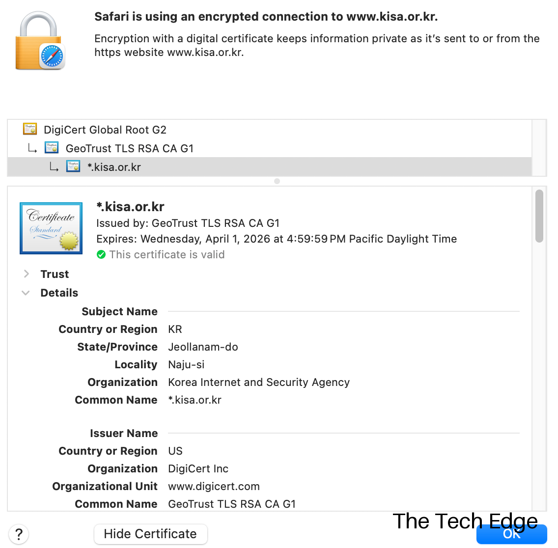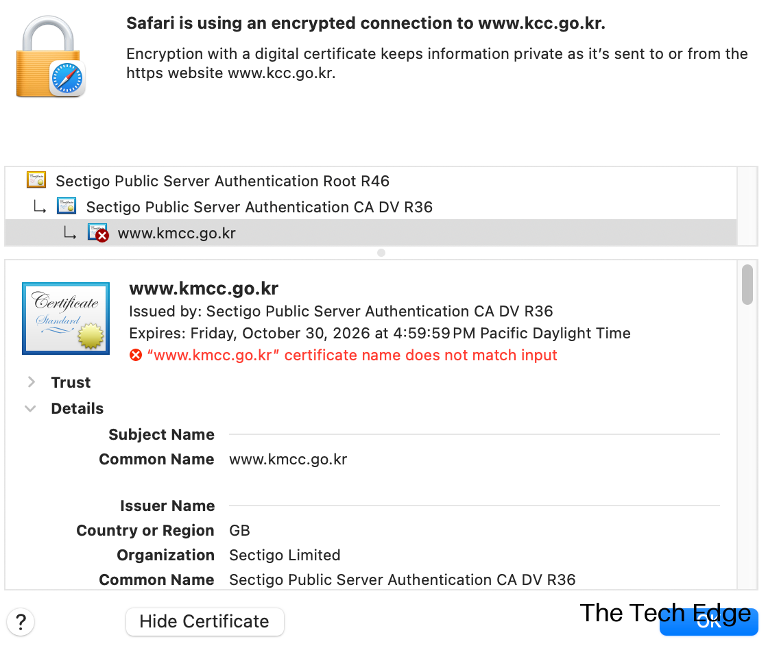 자, 그럼 정상과 비정상의 차이를 살펴보자. 먼저 봐야 할 건 도메인과 CN이 다르다는 것이다. 한국인터넷진흥원의 경우 도메인 주소는 kisa.or.kr이고 CN 역시 kisa.or.kr이다. 방송미디어통신위원회의 도메인은 kcc.go.kr인데, CN은 kmcc.go.kr이다. 무슨 말이냐면, kcc.go.kr에 접속하면 kmcc.go.kr의 인증서를 확인한다는 뜻이다.