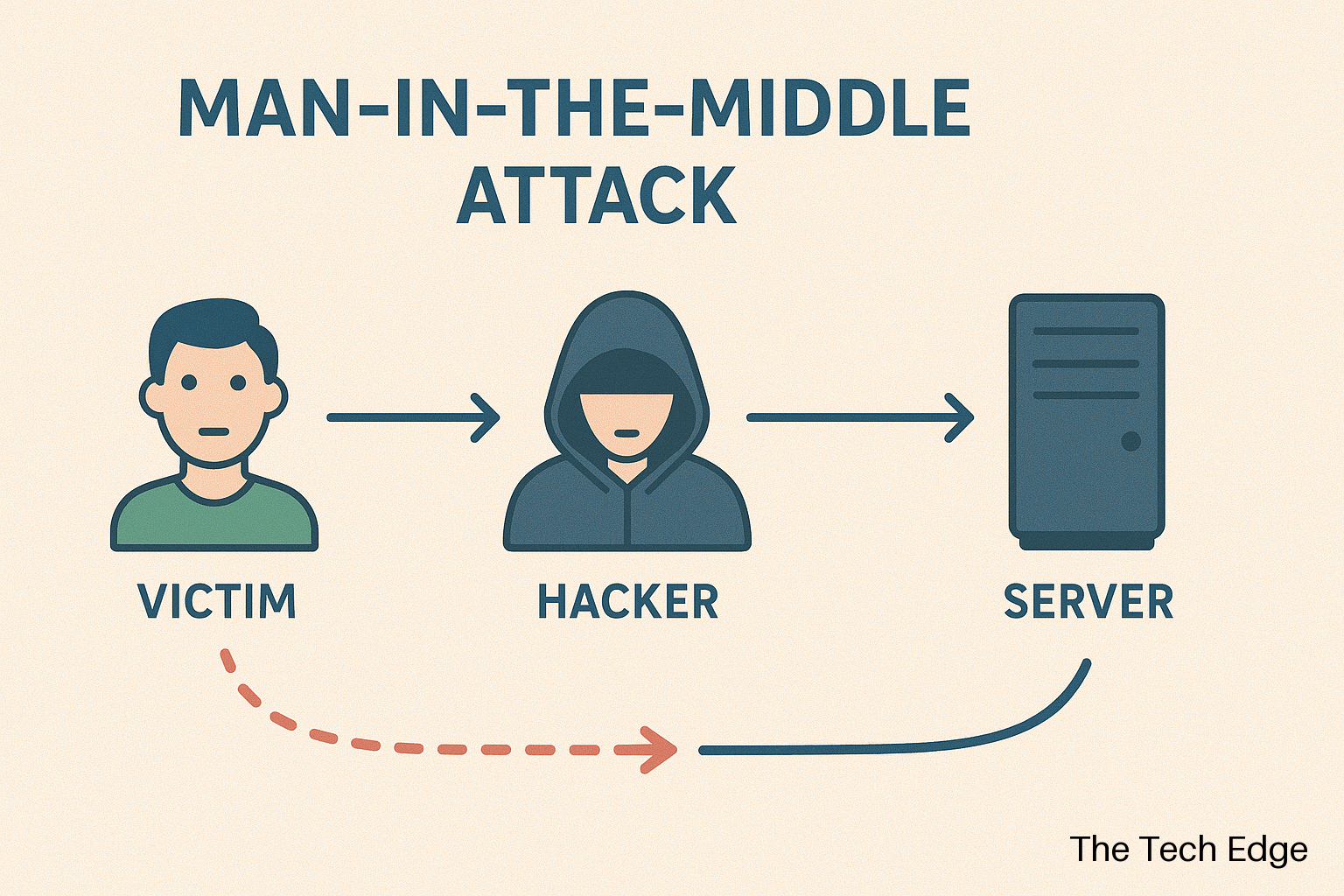 그런데 우리는 인터넷을 돌아다니다가 이러한 오류 메시지를 볼 때가 종종 있다. 해커가 ‘중간자 공격’이라는 걸 했을 때다. 공격자가 사용자와 서버 사이에 끼어들어, 원래는 사용자가 서버에 직접 보내야 하는 트래픽을 공격자가 가운데서 가로채는 것을 말한다. 다음 그림을 보면 좀 더 쉽게 이해할 수 있을 것이다.
