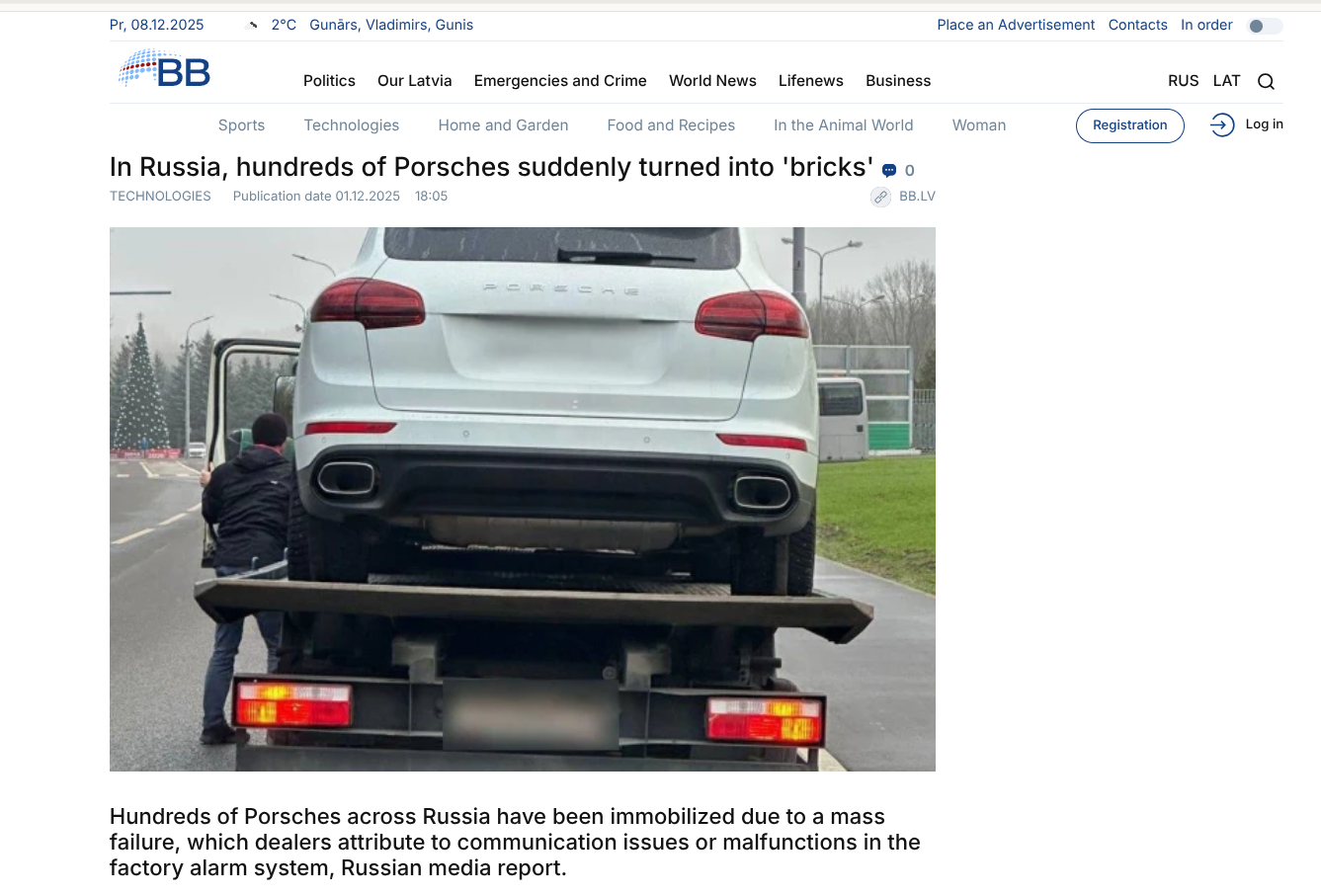이 일을 제일 먼저 보도한 것으로 보이는 러시아 매체 BB.LV는 이미 12월 1일부터 “러시아에서 수백 대의 포르셰 차량들이 작동하지 않는다”고 문제를 제기했다. 러시아 전역에서 이같은 현상이 발견됐다고 하며, “시동도 걸 수 없는 상태”라고 고발했다. 이미 이 때부터 VTS와 자동차 간 통신 두절 문제가 지적됐으며, 이후 많은 러시아 매체들이 후속 보도를 이어갔다.