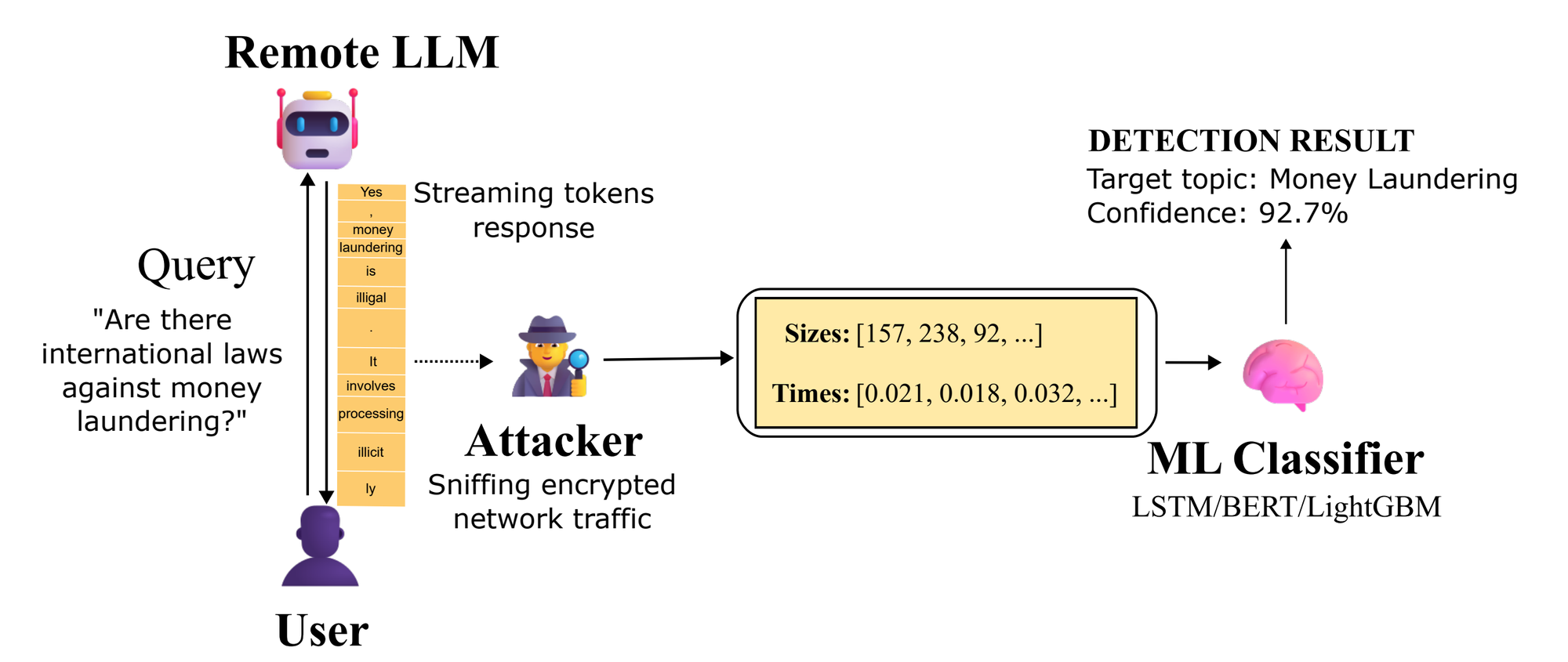 그러면서 실험자들은 ‘돈 세탁’과 관련된 다양한 질문들을 처리할 때 사용자-인공지능 간 트래픽이 어떤 패턴을 나타내는지 알 수 있게 됐고, 그것을 바탕으로 분류기가 암호화된 트래픽이든 아니든 패턴만 가지고 특정 주제를 높은 확률로 구별해낼 수 있도록 했다고 한다. 그러므로 트래픽의 암호화만 가지고 민감한 주제와 관련된 트래픽을 보호할 수 없다는 사실을 증명해낼 수 있었다.