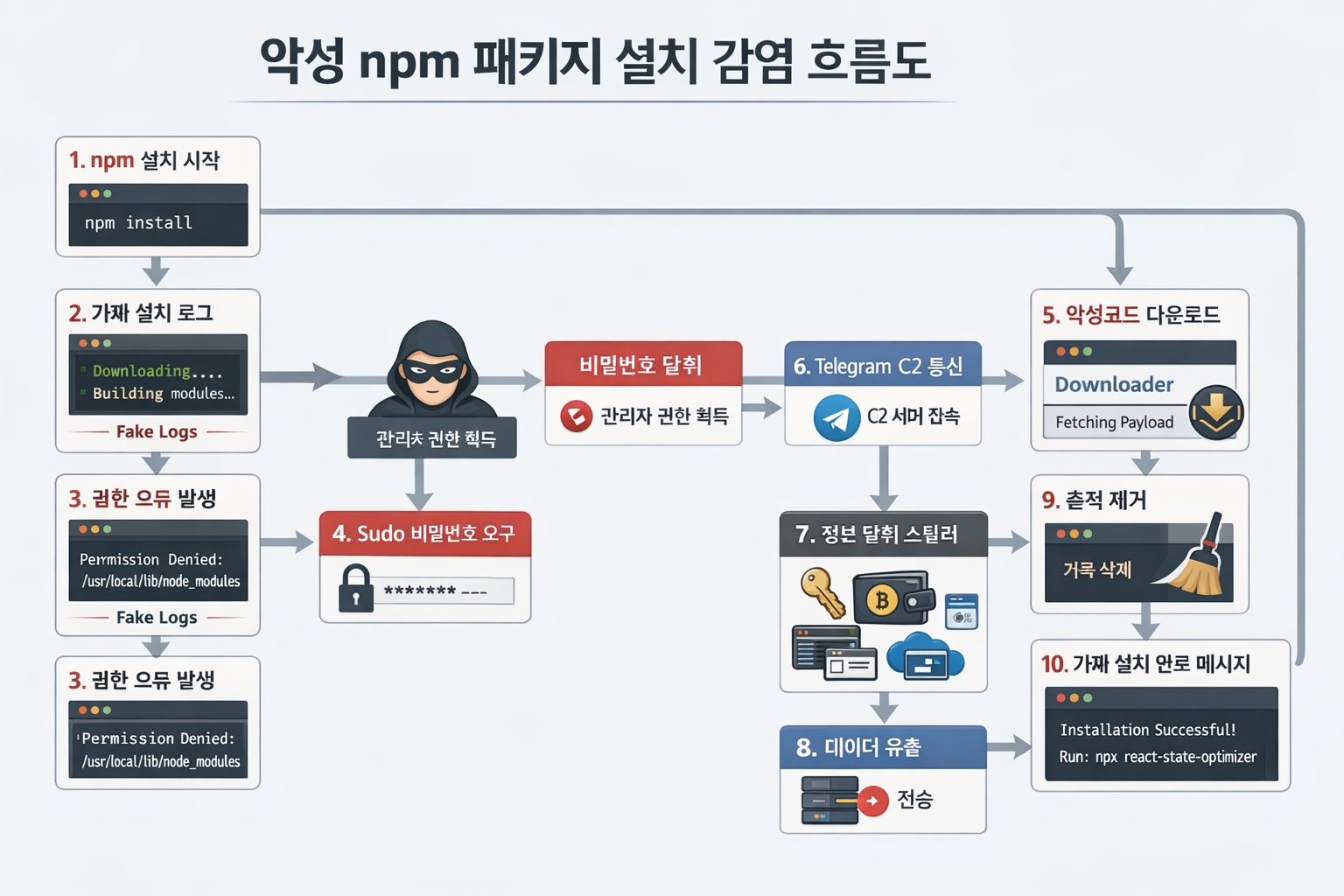 - ReversingLabs가 ‘Ghost’ 캠페인으로 명명한 공격이 react-performance-suite, react-state-optimizer-core, ai-fast-auto-trader 등 7개 악성 npm 패키지를 통해 사용자의 sudo 비밀번호를 피싱하고, GhostLoader를 내려받아 크리덴셜·시스템 정보·암호화폐 지갑을 탈취하는 과정을 분석한 보고 「Ghost Campaign Uses 7 npm Packages to Steal Crypto Wallets and System Credentials」 - The Hacker News , 2026년[1]